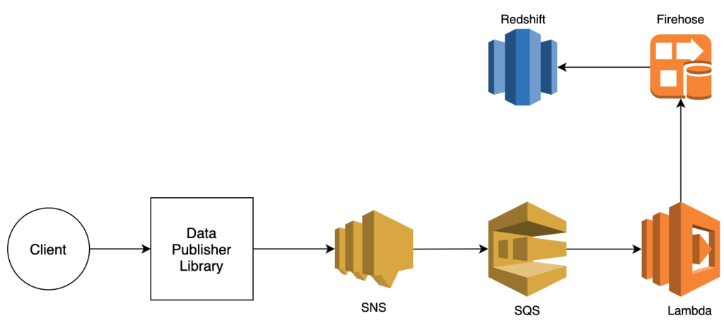 Approach 1: DataPublisherLibrary -> SNS -> SQS -> Lambda -> Firehose ->Redshift